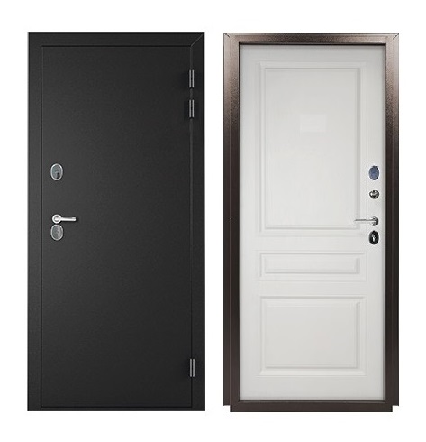 Дверь металлическая Норд металл/металл серии "Терморазрыв" оптимальное решение для установки в местах, подвергающихся воздействию природных температур. Данная конструкция двери надежно предотвращает промерзание двери при температуре на улице до минус 30 С. Дверь с терморазрывом имеет в районе притвора уникальную 2х камерную конструкцию, состоящую из холодной и теплой зон, которые разграничены между собой двойным слоем уплотнителя, пластиковым элементом в полотне и перфорацией в коробе. Дверь Норд комплектуется двумя сувальдными замками Промет 30.11 и Промет 30.01 четвертого класса взломостойкости, а также алюминиевой дверной ручкой Inspector 93 в цвете хром. Размеры наружные (ВхШхГ) 2104х1089х130 мм, Размеры светового проема (ВхШ) 1913х788 мм, Монтажные размеры короба (ВхШ) 2050х980 мм, Глубина (толщина короба, мм) 130, Толщина полотна 87 мм, 4 контура уплотнения (3 шлегель Q-Ion и 1 Е-образный), Сувальдный замок Промет 30.11, Сувальдный замок Промет 30.01, Ночная задвижка, 3 петли на подшипнике, Наполнение двери - пенополистирол высокой плотности. Применение пенополистирола в качестве внутреннего наполнителя, обеспечивает низкую теплопроводность и высокую звуконепроницаемость. Дверь Норд покрыта износостойкой полимерно-порошковой краской. Цвет внешней стороны двери: антик серебро, внутренняя сторона: фрезированный МДФ панель 6 мм, белое дерево.