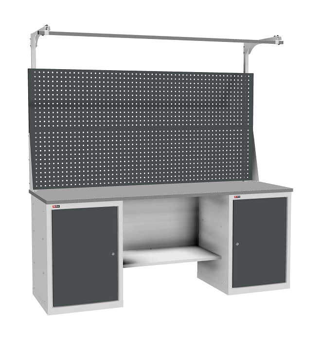 В комплектацию верстака входит: столешница ВЛ-К 200, полка и стенка ВЛ-К, две тумбы ВЛ-К-010, два перфорированных экрана ВЛ-К.