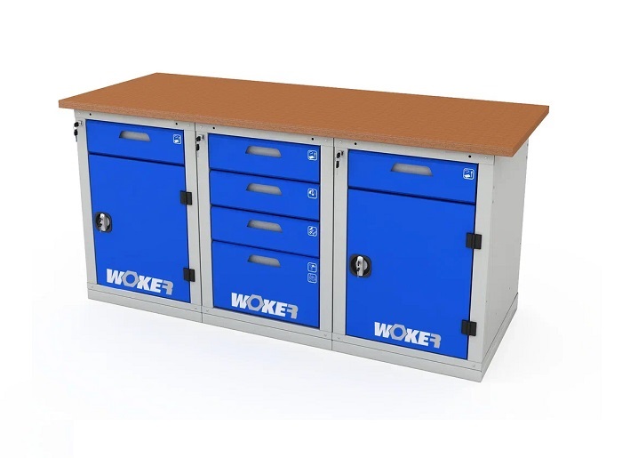 В комплектацию верстака входит: столешница Woker 2000, две тумбы Woker 02, одна тумба Woker 04. Столешница выполнена из шлифованной березовой многослойной фанеры толщиной 30 мм. Снаружи фанера обработана влагостойким антисептиком цвета "красное дерево", что придает фанере повышенную влагостойкость и более темный цвет. Тумба Woker 02 имеет одну регулируемую по высоте полку (шаг 50 мм). Полка тумбы установлены на стальные салазки, которые позволяют выдвигать полку на себя на 70% для облегчения разгрузки/погрузки. Дверь тумбы закрывается на цилиндрический замок со стальной поворотной ручкой, секретность замка 2000 комбинаций. Открывание двери на 180 градусов. Тумба Woker 04 комплектуется 4 выдвижными ящиками (3 высотой - 135 мм, 1 высотой - 275 мм). Полезный размер ящика: (ШхГ) 459х612 мм. В ящиках есть противоскользящие коврики и набор наклеек с пиктограммами для маркировки содержимого.